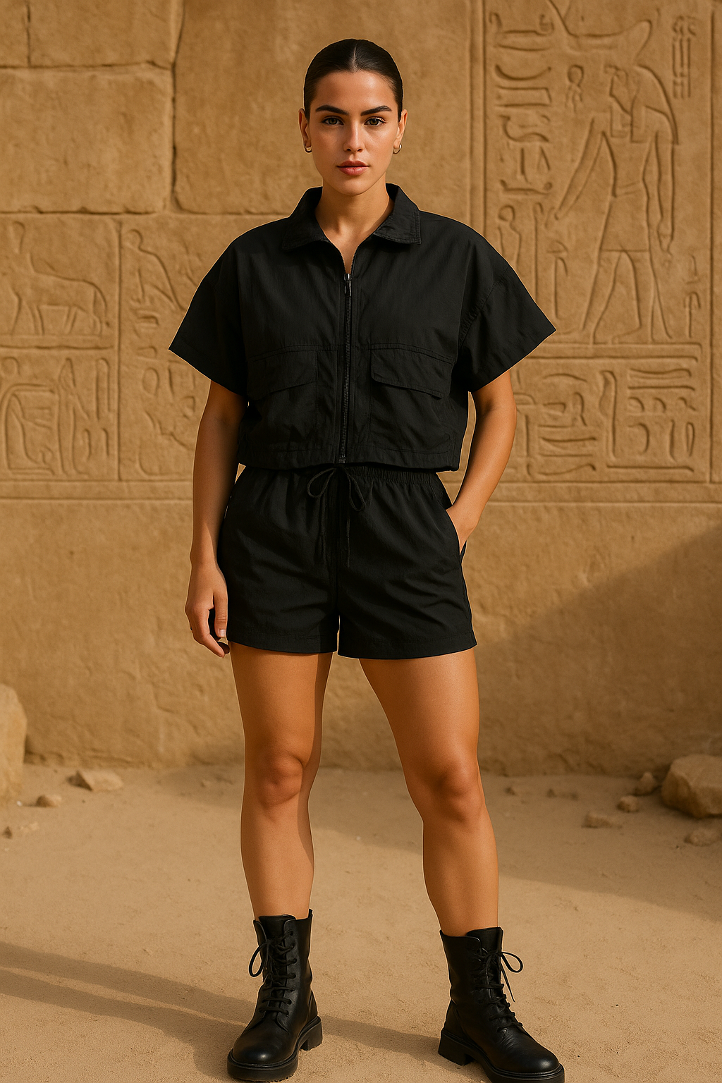 Crafted from a lightweight tech-weave fabric that mimics the look of parachute nylon without the sheen or stiffness, this set is breathable, cool against the skin, and perfect for warm-weather wear. The material has a matte finish with a soft, crinkled texture—making it ideal for casual days, travel, or streetwear styling. Think of it as an upgraded version of classic utility wear—easy, urban, and effortlessly cool.